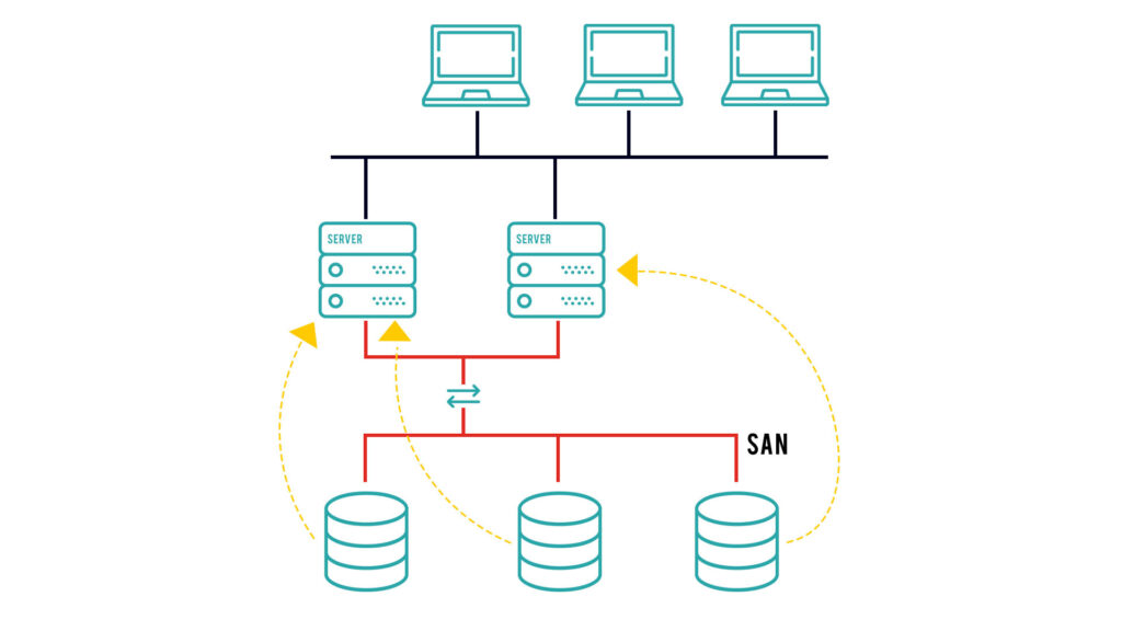 Il SAN è letteralmente un’area di stoccaggio: diversi sistemi di dischi, contenenti grandi quantità di dati, vengono connessi tra loro da uno switch, a sua volta collegato al server – fantastico direttore della logistica! – che smista i dati per fornirli agli utenti, come richiesto.