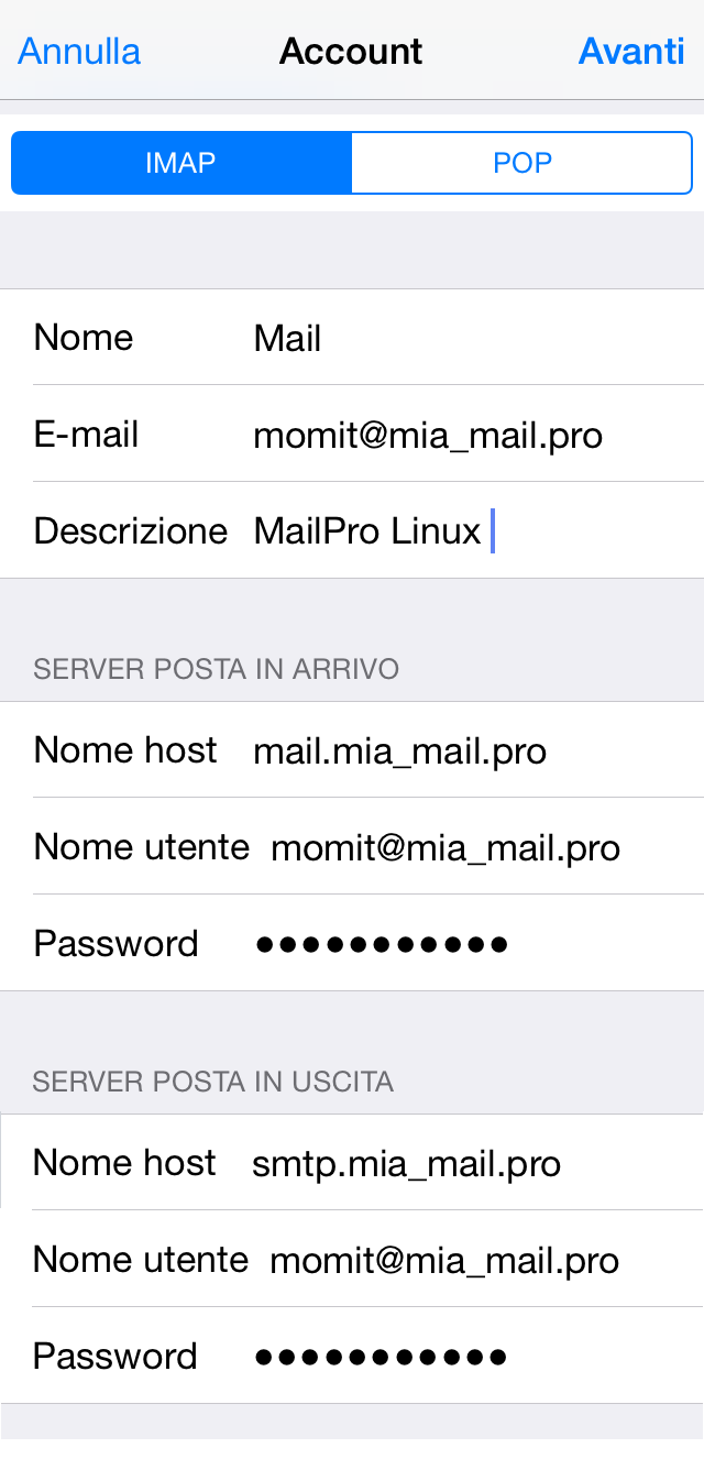 3) Proceed with the manual configuration of the parameters as shown in the image and complete the configuration of the fields for incoming and outgoing mail. For incoming mail it is necessary to choose whether to have a POP3 or IMAP mailbox, the MailPro Linux solution supports both standards. If you don’t know the difference between IMAP and POP and which protocol is best suited to your needs, please read this article.